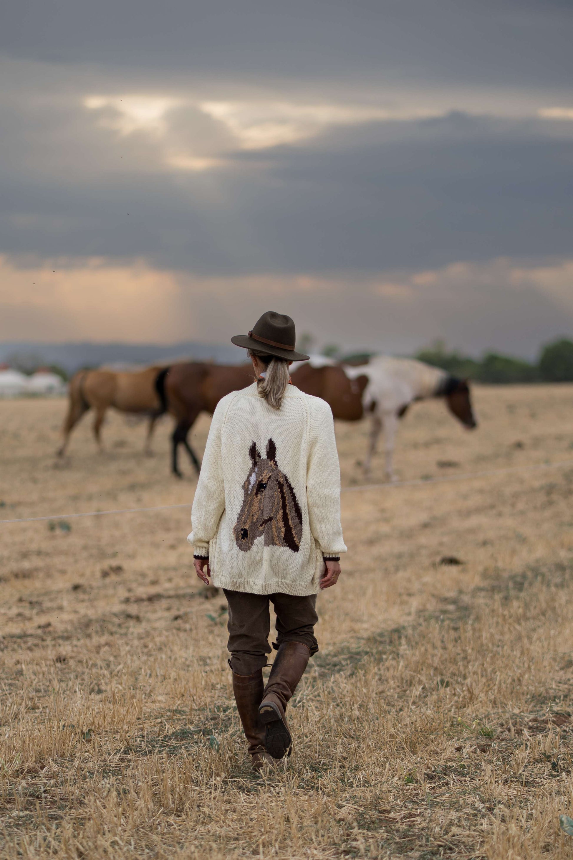 Wrap yourself in heritage and heart with our Hand-Knitted Merino Wool Cardigan — a timeless piece made for lovers of craftsmanship and the equestrian lifestyle. Featuring a classic fit and a beautifully detailed horse head motif on the back, each cardigan is made-to-order and hand-knitted by our village grandmas in Bulgaria.